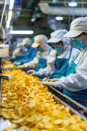 Busy food production line with workers in sterile gear inspecting and processing vibrant yellow chips.