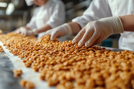 Workers on an industrial food production line meticulously handling and inspecting food quality.