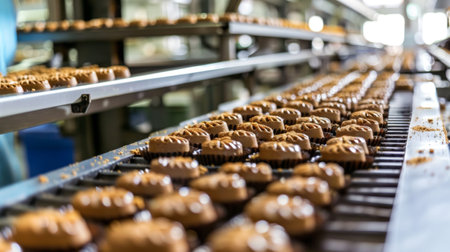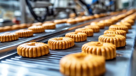A vibrant close-up of freshly baked cookies arranged neatly on a conveyor belt in a busy bakery. The shiny surface reflects the care and quality of the craft.