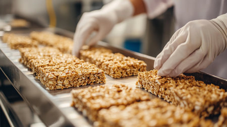Food production line utilizing AI technology to assemble granola bars efficiently