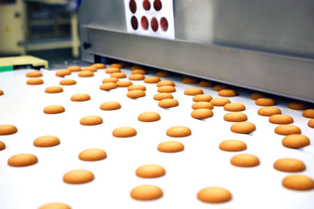 Baking production line. Raw uncooked cookies after forming going to oven by conveyor.