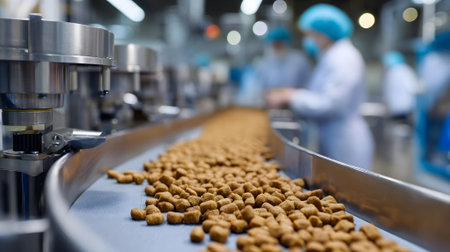 Conveyor belt with food in pet food factory. Selective focus.ai generated