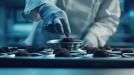 Close-up of chef in professional kitchen using gloves while carefully placing chocolate truffles on metal plate, showcasing culinary artistry.