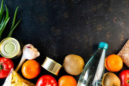 Food supply quarantine food crisis isolated on black concrete background. Cereals, canned food, pasta, fruits, vegetables, water. The concept of food delivery, donation, charity. Copyspace.flat lay
