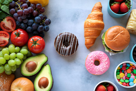 A split view showing a vibrant assortment of fresh fruits and vegetables contrasted with tempting donuts, a croissant, and a burger.