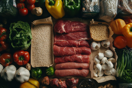 A variety of vibrant vegetables, succulent meats, and wholesome grains are artfully displayed, inviting healthy meal preparation and creativity.