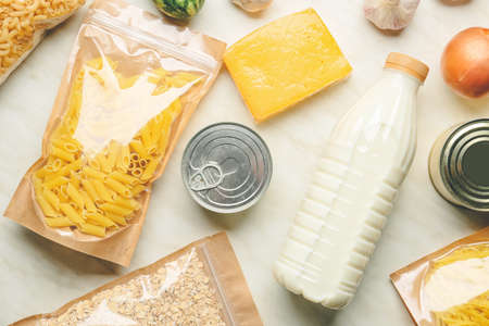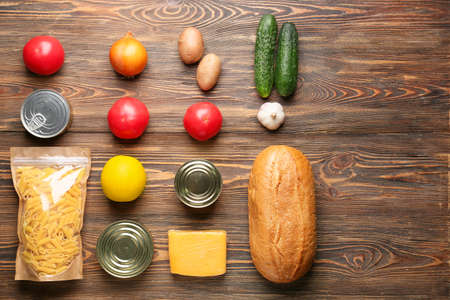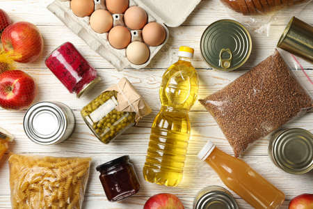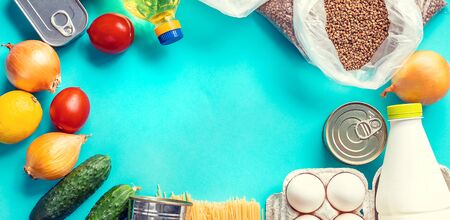 Set of grocery items from canned food, vegetables, cereal. Food delivery concept. Donation concept. Top view.