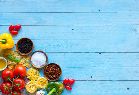Culinary recipe. Italian pasta organic ingredients. Spaghetti cluster tomato sweet pepper.