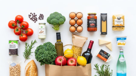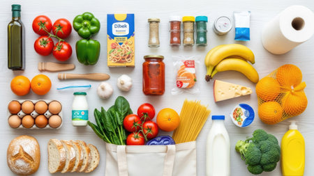 A top-down view showcases a diverse arrangement of fresh produce and pantry staples. Tomatoes, bell peppers, oranges, and bananas are presented alongside pasta, eggs, and dairy products. The scene uses natural lighting, possibly indoors, suitable for commercial or editorial applications related to healthy eating or cooking.