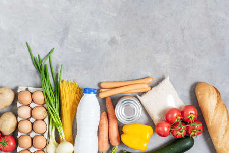 Variety of vegetables and grocery products on grey concrete table top view. Healthy food background.