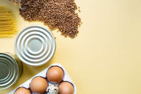 Food stock for quarantine isolation period on yellow background. Rice, egg, canned food, buckwheat, spaghetti. Food delivery, Donation. Copyspace