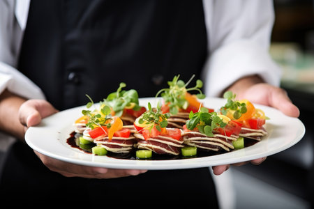 A chef in a white uniform holds a plate with a beautifully arranged gourmet dish, showcasing culinary expertise.