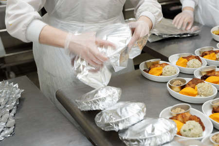 Chef preparing dish to a box in the restaurant for food delivery service to home, online ordering