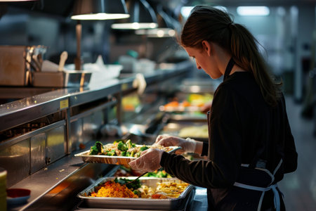 A woman stands in a kitchen, carefully preparing food on a tray, A cafeteria worker carefully preparing a tray of food for a customer