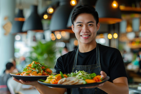 plates of dish with fried vegetables and salad with greens and seafood in hands of waiter