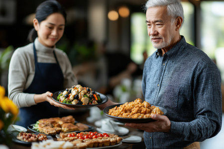 female waitress handling male customer choosing food using food tongs at traditional stall display