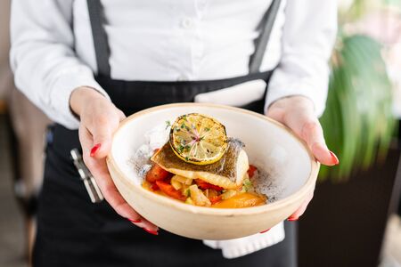 The waiter is holding a plate Roasted pike perch or cod fish with baked vegetables. Dish decorated with a slice of lemon. Restaurant menu