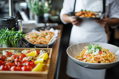 Delicious Italian pasta with tomatoes, lemon, and herbs served in a restaurant, showcasing a vibrant culinary experience with a soft focus background