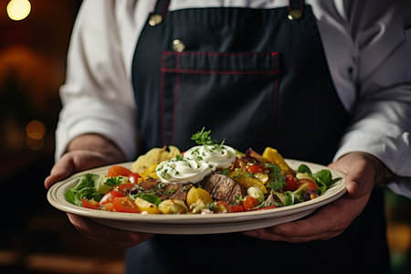 close-up on the hand of a waiter carrying food duck steak with caramelized vegetables. Food styling and restaurant meal serving.