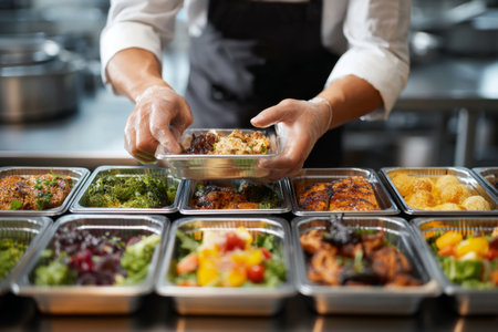 In a busy kitchen, a chef with gloves carefully arranges a healthy meal in a container. Fresh ingredients and vibrant dishes are lined up, ready for delivery.