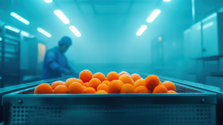 A close-up of freshly harvested orange fruits ready for processing in a modern food factory. The cool lighting and industrial background set a clean workspace atmosphere.