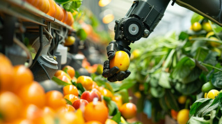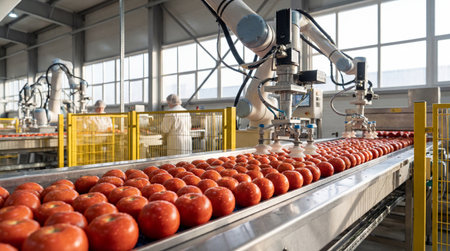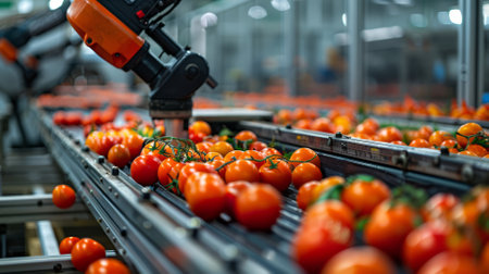 automated robotic arms sorting fresh tomatoes on a modern conveyor line in a high tech food processing and packaging facility.
