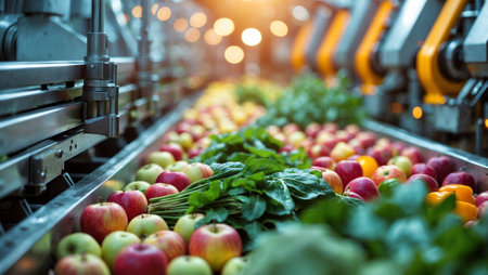 Freshly harvested fruits and vegetables on a conveyor belt in a packing facility