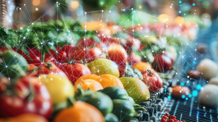 A vibrant display of fresh fruits and vegetables in a market setting, featuring digital connection elements that highlight technology's role in modern agriculture.
