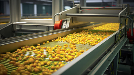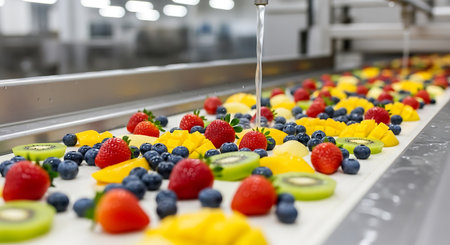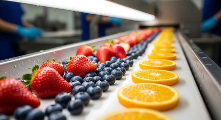 Conveyor belt with fresh fruits and berries in a modern factory