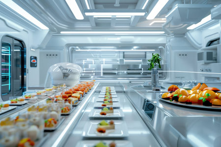 AI-powered robotic arms handling food processing in a futuristic automated kitchen, digital transformation in food industry with copy space.