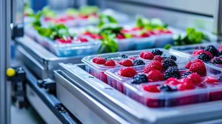 A visually captivating image of fresh strawberries arranged in clear plastic containers on a food processing line, highlighting the modern techniques and efficiency in fruit packaging.
