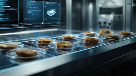 This image illustrates an advanced kitchen environment featuring automated cooking technology with crispy food items displayed in transparent plates, emphasizing modern culinary innovation.
