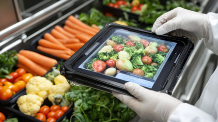 A technician in white gloves holds a tablet showcasing fresh vegetables in a food processing setting, reflecting the integration of technology in promoting health and safety in food preparation.
