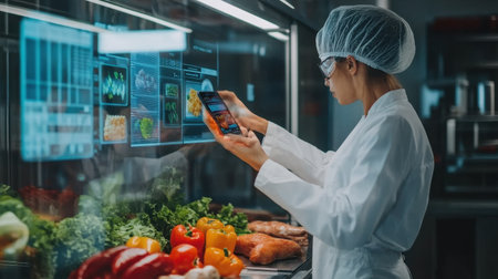 A female food technologist in a white lab coat uses a smartphone to assess the quality of fresh produce in a modern laboratory setting, with digital screens displaying relevant data.