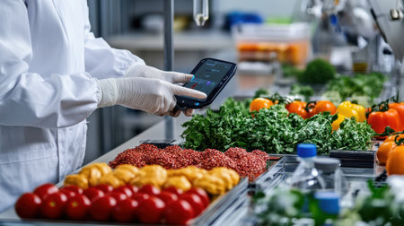 A scientist in a laboratory setting uses a tablet to analyze data while surrounded by fresh vegetables, showcasing technology's role in modern food processing and nutrition.