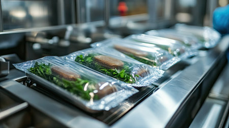 This image captures a conveyor belt loaded with packaged food containers, highlighting the modern food processing industry and its commitment to efficiency and quality.