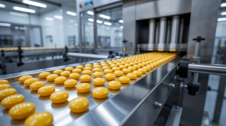 Conveyor belt with yellow pills on production line in factory.