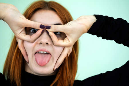Funny pretty redhead girl showing glasses sign with her fingers.