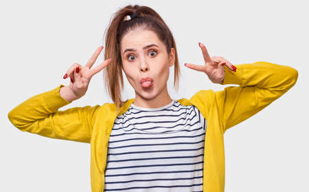 Portrait of funny young woman showing tongue and peace gesture while looking to the camera and standing against white background. Happy female wearing casual outfit shows her emotions.