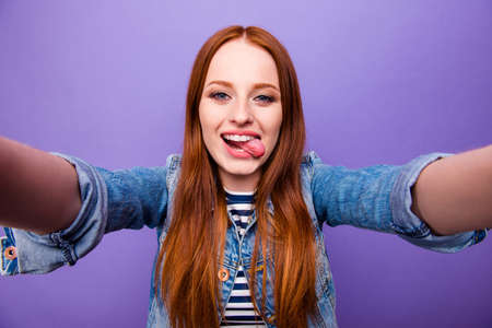 Self-portrait of her she nice attractive charming cute lovely cheerful cheery crazy emotional straight-haired lady youngster youth isolated over bright vivid shine violet background