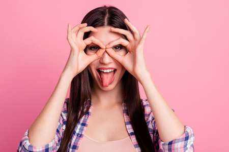 Close up photo amazing beautiful her she lady hold arm hand fingers okey symbol near brown eyes playful mood tongue out mouth wear casual checkered plaid shirt clothes outfit isolated pink background