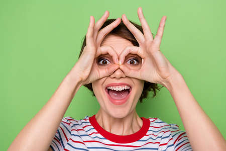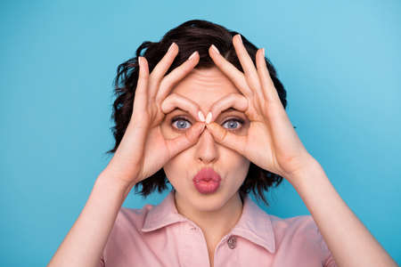 Close-up portrait of pretty cheerful girl showing ok-sign like specs having fun