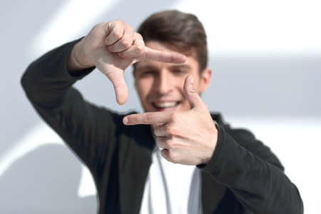 modern guy looks into the frame formed by his hands.
