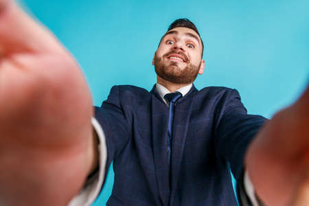 Portrait of positive bearded handsome young adult man wearing official style suit taking selfie, looking at camera with funny smile , POV. Indoor studio shot isolated on blue background.