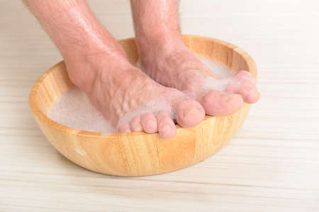 Male feet in a bowl with water and soap, hygiene and spa concept