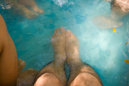 Feet with peeling feet fish in clear water. Famous thermal lake Vouliagmeni, Athens riviera, Attica, Greece