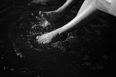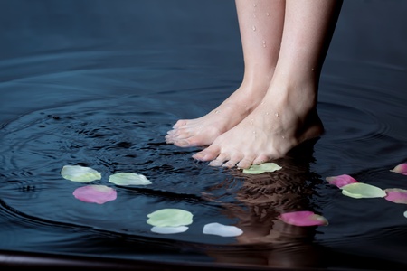 Womens feet splashed water on a hot summer day