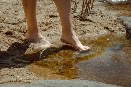 Side view of a woman's feet walking and feeling the cool water of a crystal clear river. Concept of healthy outdoor life.
