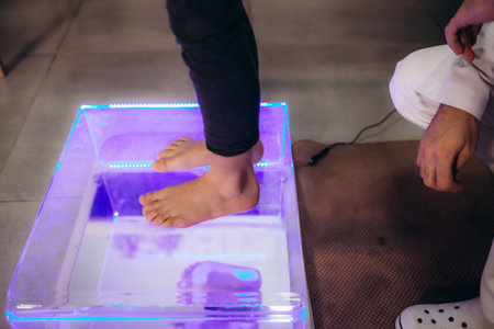 Close up of doctor checks child girl sitting on plantoscope by orthopedist. Kids examination flatfoot. High quality photo