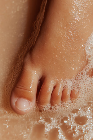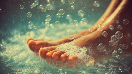 beautiful female feet closeup in soapy foam
